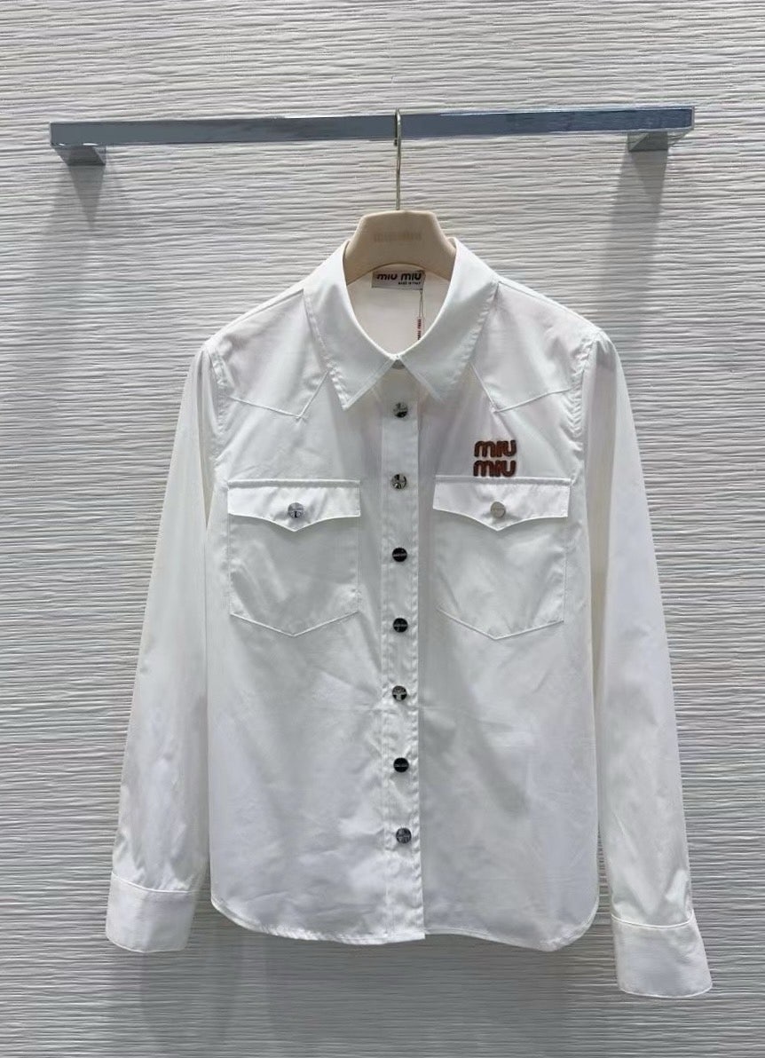-화이트 컬러의 가슴포켓위에 미우미우 로고로 아이코닉한