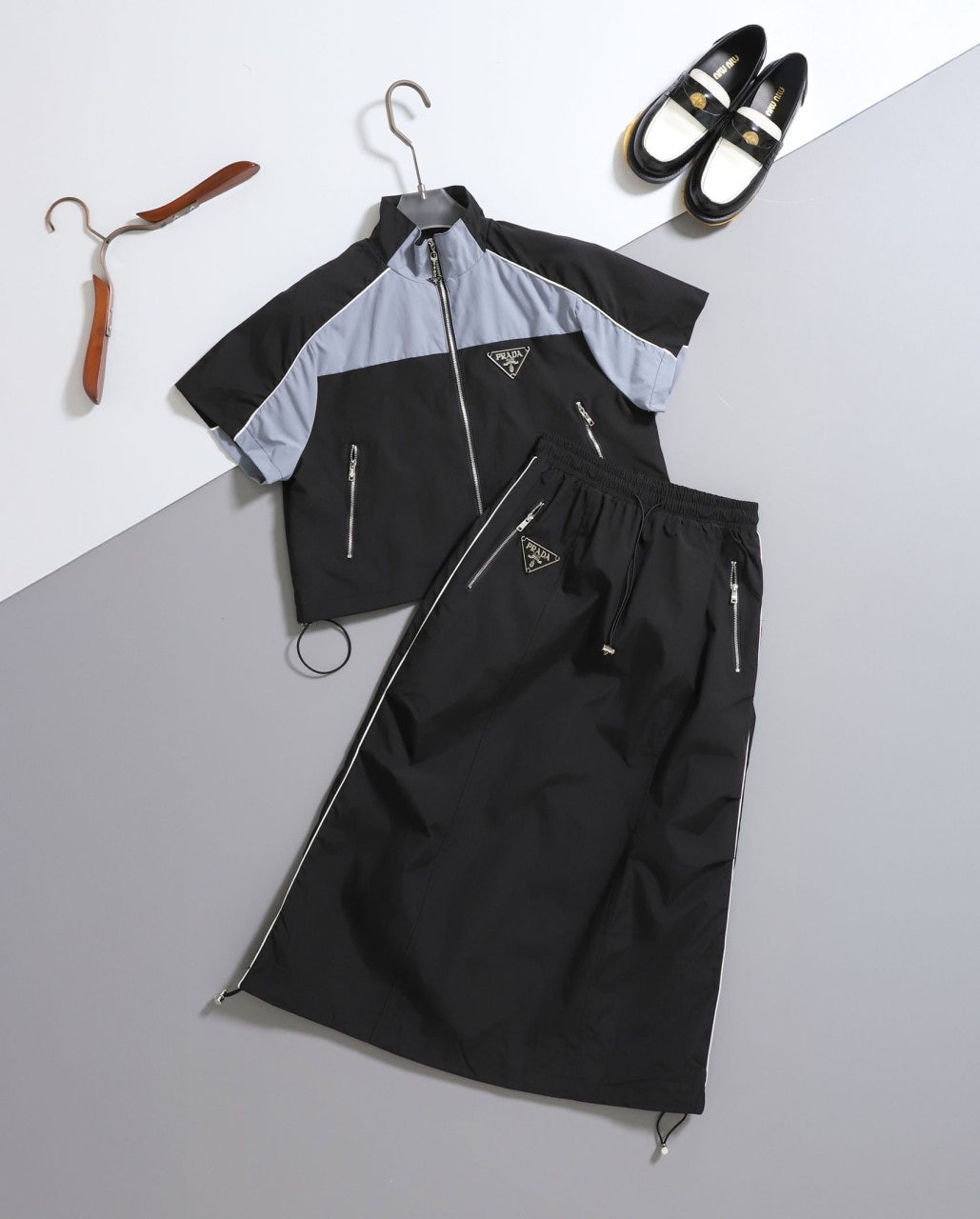 프라다 삼각로고 컴피 우븐 자켓 & 스커트 세트