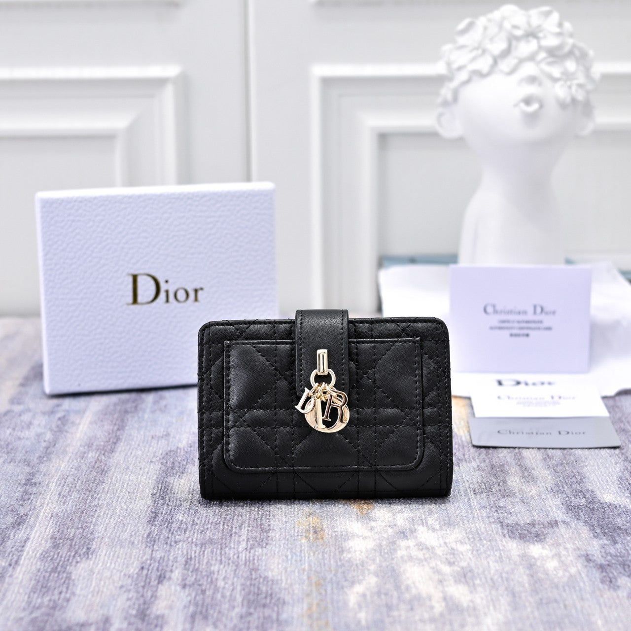 반지갑 디자인의 My Dior Dittany 지갑입니다. 블랙 까나쥬 양가죽 소재로 제작되었으며 앞면의 페일 골드 피니시 메탈 D.I.O.R. 블록 참 장식이 돋보입니다. 다양한 기능 덕분에 데일리 소지품을 모두 보관할 수 있으며 My Dior 라인의 다른 아이템들과 매치하기 좋습니다.