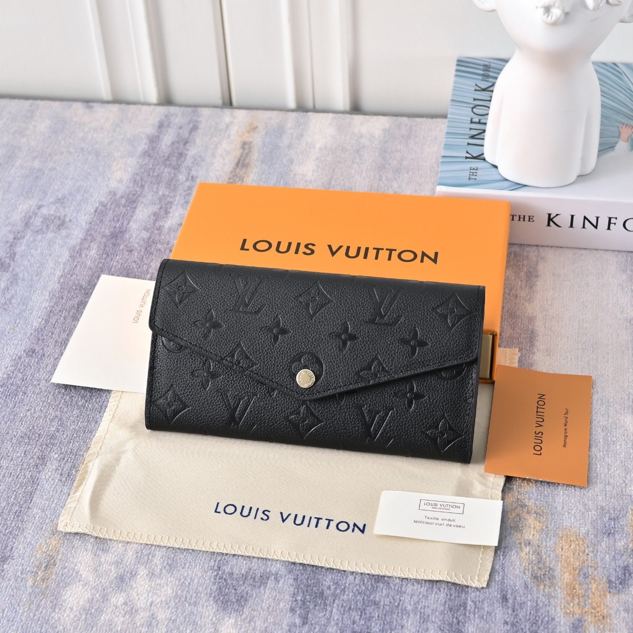 모노그램 앙프렝뜨 가죽 소재로 선보이는 사라 월릿. 양각으로 새긴 루이 비통의 상징적인 모노그램 패턴이 특징. 엔벨로프 스타일의 플랩. 다수의 신용카드 슬롯과 지퍼형 코인 포켓 등 다양하고 실용적인 기능을 갖춘 내부 구조.